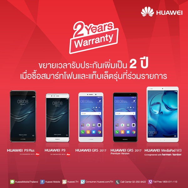 เดือนแห่งความรักทั้งที แบรนด์สมาร์ทโฟนยักษ์ใหญ่อย่าง “หัวเว่ย” ขอเอาใจลูกค้าคนสำคัญด้วยการมอบบริการหลังหลังการขาย “2 Years Warranty” ประกันเครื่องยาวนานถึง 2 ปี ซึ่งครอบคลุมการรับประกัน เมนบอร์ด, หน้าจอ และแบตเตอรี่ โดยฟรีค่าบริการและค่าอะไหล่สำหรับลูกค้าที่ซื้อสินค้ามือถือหัวเว่ยรุ่น Huawei P9,P9 Plus, MediaPad M3, GR5 2017, และ GR5 2017 Premium Version ตั้งแต่วันที่ 8 กุมภาพันธ์ – 9 มีนาคม 2560 พร้อมจัดเต็มอีก 3 ข้อเสนอสุดพิเศษ โดยจะมีอะไรบ้างนั้น มาดูกัน…