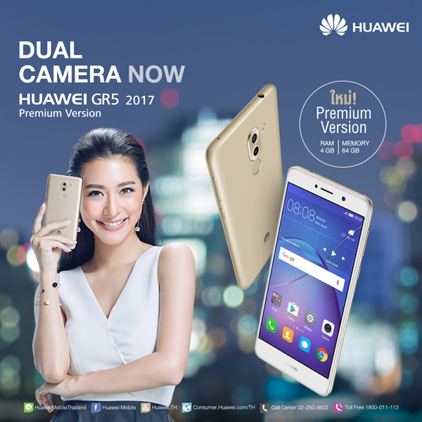 เปิดตัวน้องใหม่ Huawei GR 5 2017 Premium Version สมาร์ทโฟนกล้องคู่ ในความจุที่เพิ่มขึ้นกว่าเดิมด้วย RAM 4 GM และ ROM 64GB ในราคา 10,900 บาท โดยมีให้เลือก 2 สี คือ สีทอง และสีเทา ที่มาพร้อมของสมมนาคุณ Mini tripod มูลค่า 790 บาท (จำนวนจำกัด)