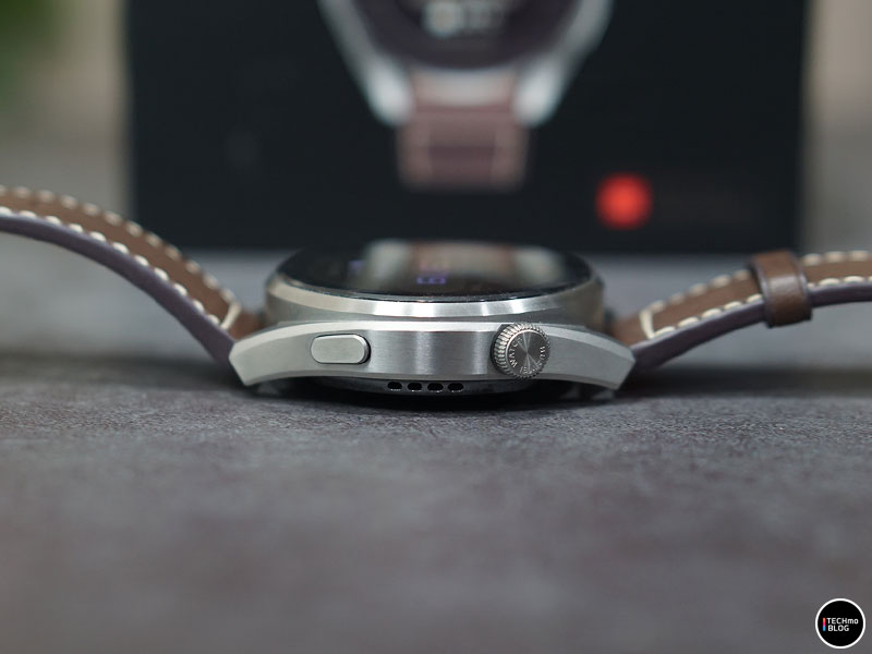ฝั่งขวาตัวเครื่อง เป็นเม็ดมะยมที่มีการสลักคำว่า HUAWEI WATCH สามารถกดได้ หรือหมุนเพื่อปรับระดับเสียงได้ และปุ่มกดสำหรับเข้าใช้งาน Quick Menu สามารถตั้งค่าได้ตามสไตล์การใช้งาน ส่วนด้านล่างเป็นลำโพงเสียง