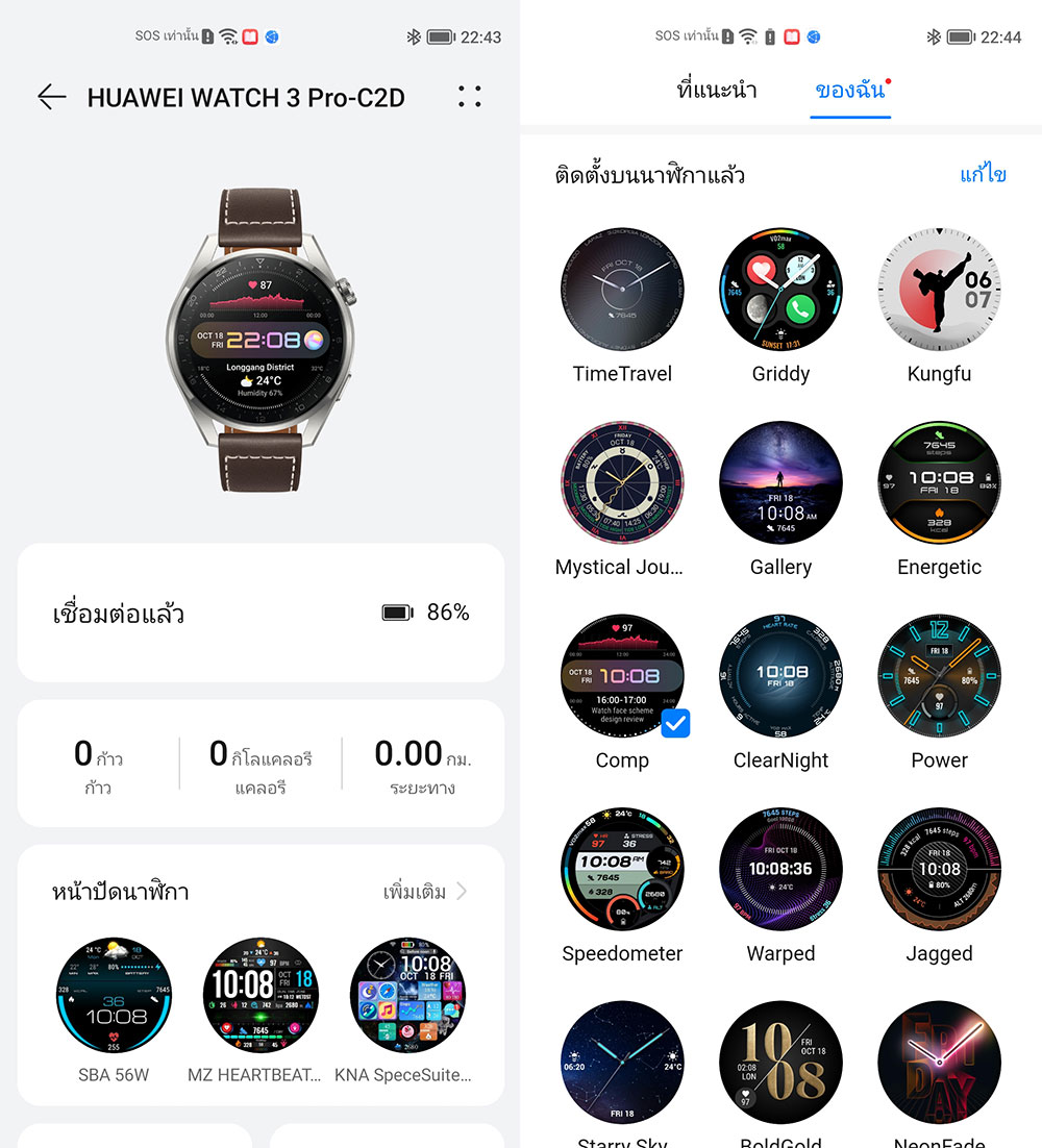 เมื่อทำการจับคู่ HUAWEI WATCH 3 Pro กับสมาร์ทโฟนสำเร็จแล้ว จะสามารถปรับแต่งหน้าปัดได้เลยผ่านแอปฯ HUAWEI Health ซึ่งมีให้เลือกหลากหลายรูปแบบ นอกจากนี้ ยังมีการแสดงข้อมูลแบตเตอรี่ที่เหลืออยู่อีกด้วย