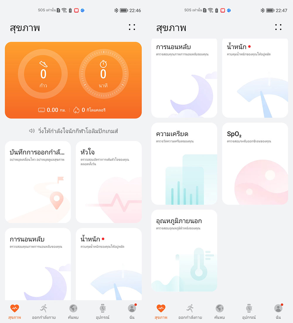 สำหรับแอปพลิเคชัน HUAWEI Health จะมีการแสดงข้อมูลด้านสุขภาพต่าง ๆ จาก HUAWEI WATCH 3 Pro ไม่ว่าจะเป็น การนับก้าวเดิน, บันทึกการออกกำลังกาย, อัตราการเต้นของหัวใจ, การนอนหลับ, น้ำหนัก, ความเครียด, ระดับออกซิเจนในเลือด และวัดอุณหภูมิร่างกาย