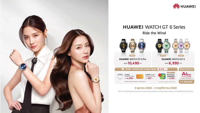 HUAWEI WATCH GT 6 Series พร้อมเป็นผู้ช่วยดูแลสุขภาพแล้ววันนี้ โดย HUAWEI WATCH GT 6 Pro (46 มม.) ราคาเริ่มต้น 10,490 บาท มีให้เลือกทั้งสีดำ สีน้ำตาล และสีไทเทเนียม ส่วน HUAWEI WATCH GT 6 (46 มม.) ราคาเริ่มต้น 6,990 บาท มาพร้อมสีเขียว และสีดำ และ HUAWEI WATCH GT 6 (41 มม.) ราคาเริ่มต้น 6,990 บาท มีให้เลือกในสีม่วง สีขาวสายหนัง และสีทอง Milanese Gold พิเศษ! เมื่อซื้อระหว่าง 2 ตุลาคม 2568 – 2 พฤศจิกายน 2568 รับของสมนาคุณมูลค่ารวมสูงสุด 8,146 บาท[2] อาทิ HUAWEI FreeBuds 6i (สีขาว) มูลค่า 4,299 บาท, HUAWEI Health+ Membership 3 เดือน มูลค่า 357 บาท และฟีเจอร์กอล์ฟระดับพรีเมียม มูลค่า 3,490 บาท[3] (เฉพาะรุ่น HUAWEI WATCH GT 6 Pro เท่านั้น) พร้อมประกันภัย ALive Powered by AIA คุ้มครองชีวิตจากการเจ็บป่วยและอุบัติเหตุ 1 ปี สูงสุด 200,000 บาท