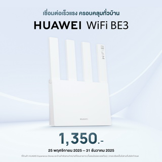 HUAWEI WiFi Mesh X1 Pro พร้อมมอบทั้งการเชื่อมต่อที่ความเร็วเต็มพิกัดระดับ Wi-Fi 7 สัญญาณแรงทั่วถึงทั้งบ้าน และงานออกแบบที่ได้รับรางวัลจากเวทีระดับโลก ในราคาเพียง 2,890 บาท จากปกติราคา 3,990 บาท พร้อมรับส่วนลด 50 บาทและจัดส่งฟรี! ส่วน HUAWEI WiFi BE3 นำสมรรถนะระดับ Wi-Fi 7 และเทคโนโลยีเพื่อการเชื่อมต่อและความปลอดภัยครบครัน มาให้สัมผัสกันที่ราคา 1,350 บาทเท่านั้น เมื่อสั่งซื้อระหว่างวันที่ 25 พฤศจิกายน 2568 ถึงวันที่ 31 ธันวาคม 2568 ผ่านหน้าร้าน HUAWEI Experience Store และร้านค้าตัวแทนจำหน่ายที่ร่วมรายการ รวมถึงช่องทางออนไลน์ทั้ง HUAWEI Store, Lazada, Shopee และ TikTok Shop