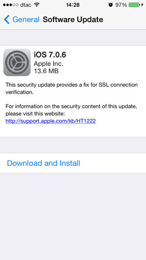 [22-กุมภาพันธ์-2557] หลังจากปล่อยอัพเดท iOS 7.0.5 เมื่อปลายเดือนมกราคมที่ผ่านมา แก้ปัญหาเรื่องเครือข่าย สำหรับผู้ใช้ในประเทศจีน ล่าสุด แอปเปิล ปล่อยอัพเดท iOS 7.0.6 (Build 11B651) ออกมา เพื่อแก้ไขปัญหาเรื่องการเชื่อมต่อ SSL ครับ นอกจากนี้ ยังปล่อยอัพเดท iOS 6.1.6 (build 10b500) สำหรับ iPhone 3GS, iPod Touch Gen 4 รวมไปถึง Apple TV เวอร์ชัน 6.0.2 เพื่อแก้ปัญหาดังกล่าวด้วยเช่นกัน
