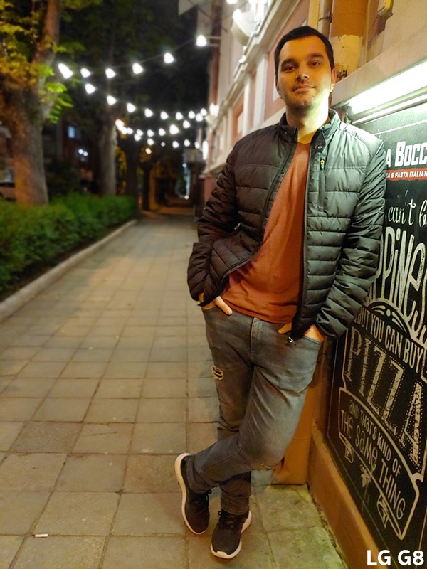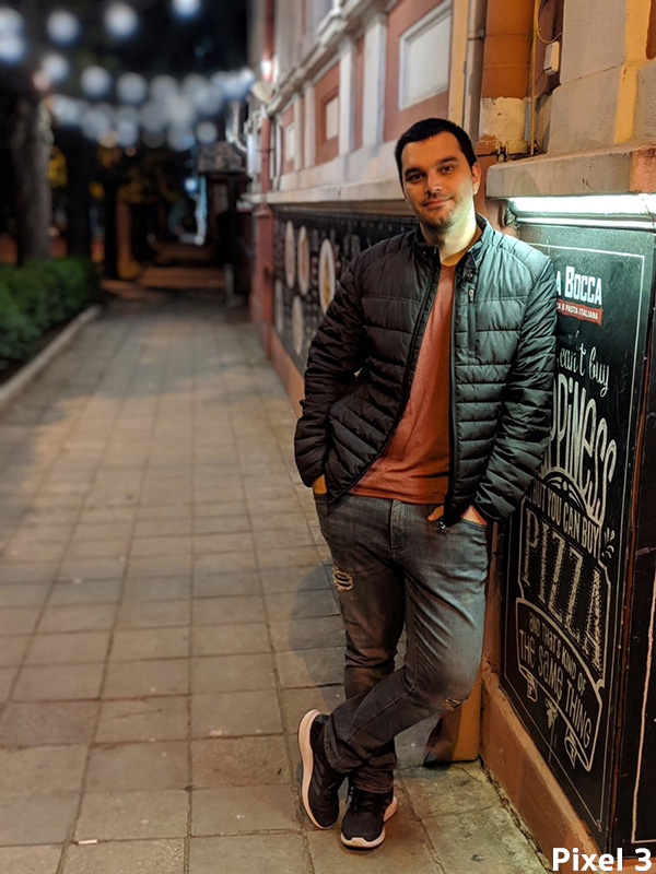 มาถึงซีนท้าทายสำหรับสมาร์ทโฟนทุกรุ่นกันบ้าง กับการถ่ายภาพในตอนกลางคืน ที่มีแสงสว่างจากไฟข้างทางและไฟร้านค้าเท่านั้น ซึ่งถ้าหากมองในภาพรวมแล้ว ไม่มีรุ่นไหนถ่ายภาพในตอนกลางคืนได้ดีเลย เพราะนอกจากจะได้ภาพที่มี noise เยอะแล้ว ภาพที่ได้ยังไม่คมชัด และติดโทนเหลืองอีกด้วย แต่ถ้าให้เลือกรุ่นที่ทำได้ดีที่สุด ก็คงจะเป็น Pixel 3 ที่ได้คะแนนในส่วนของ White Balance และความคมชัดไป ถัดมาก็คือ Huawei P30 Pro ส่วนรุ่นที่ได้คะแนน้อยสุดในซีนนี้ ก็คือ LG G8 ซึ่งภาพที่ได้ดูบิดเบี้ยวเล็กน้อย (เนื่องจากต้องถ่ายใกล้วัตถุมาก ๆ) รวมถึง White Balance ติดโทนเขียว