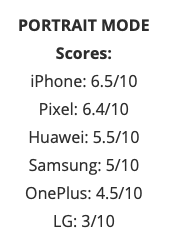 และจากการทดสอบในข้างต้น ทางทีม phonearena.com ให้ iPhone XS ถ่ายภาพ Portrait ได้ดีที่สุดที่ 6.5 คะแนน ตามมาด้วย Pixel 3 ทำได้ 6.4 คะแนนในอันดับที่ 2, Huawei P30 Pro (5.5 คะแนน) ในอันดับที่ 3 และ Samsung Galaxy S10+ (5 คะแนน), OnePlus 6T (4.5 คะแนน) และ LG G8 (3 คะแนน) ในอันดับที่ 4, 5 และ 6 ตามลำดับ