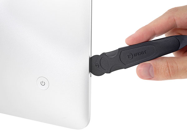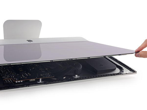 เมื่อชมดีไซน์ภายนอกและทราบสเปกคร่าวๆ กันไปแล้ว ก็ได้เวลาชำแหละกันสักทีครับ ก่อนอื่นก็เริ่มจากการถอดหน้าจอออกมาซะก่อน ซึ่งหน้าจอของ iMac รุ่นนี้จะยึดไว้ด้วยกาว หากใช้เครื่องมือเหมาะๆ จะถอดได้ไม่ยาก อย่างที่ iFixit ใช้ก็จะมีหน้าตาคล้ายๆ มีดตัดพิซซ่าอย่างที่เห็นด้านล่าง