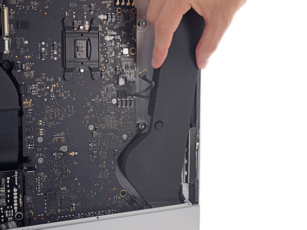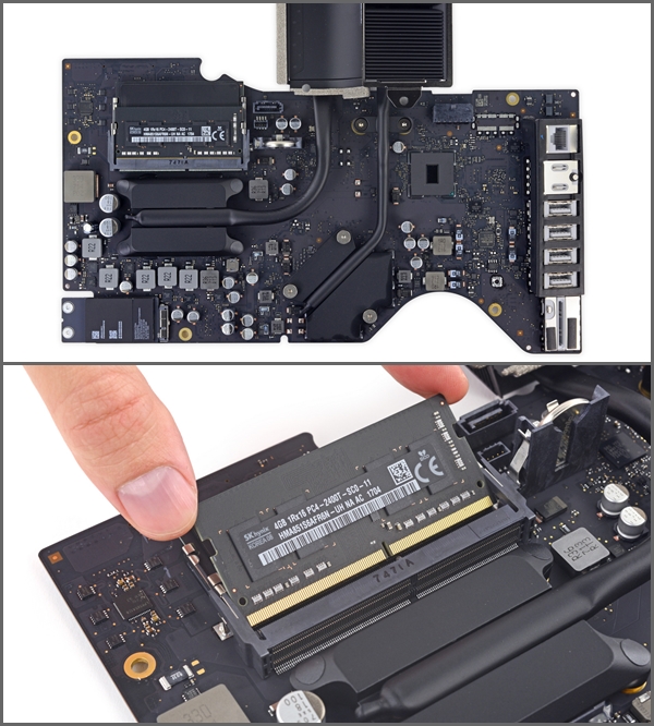 ที่น่าสนใจคือแผง RAM ใน iMac รุ่นนี้สามารถถอดเปลี่ยนเพื่ออัปเกรดได้แล้ว แต่ถึงอย่างนั้นก็ไม่ใช่จะถอดได้ง่ายๆ เพราะกว่าจะเข้ามาถึงสล็อต RAM ต้องถอดชิ้นส่วนต่างๆ ออกมาเกือบหมดเลยทีเดียว