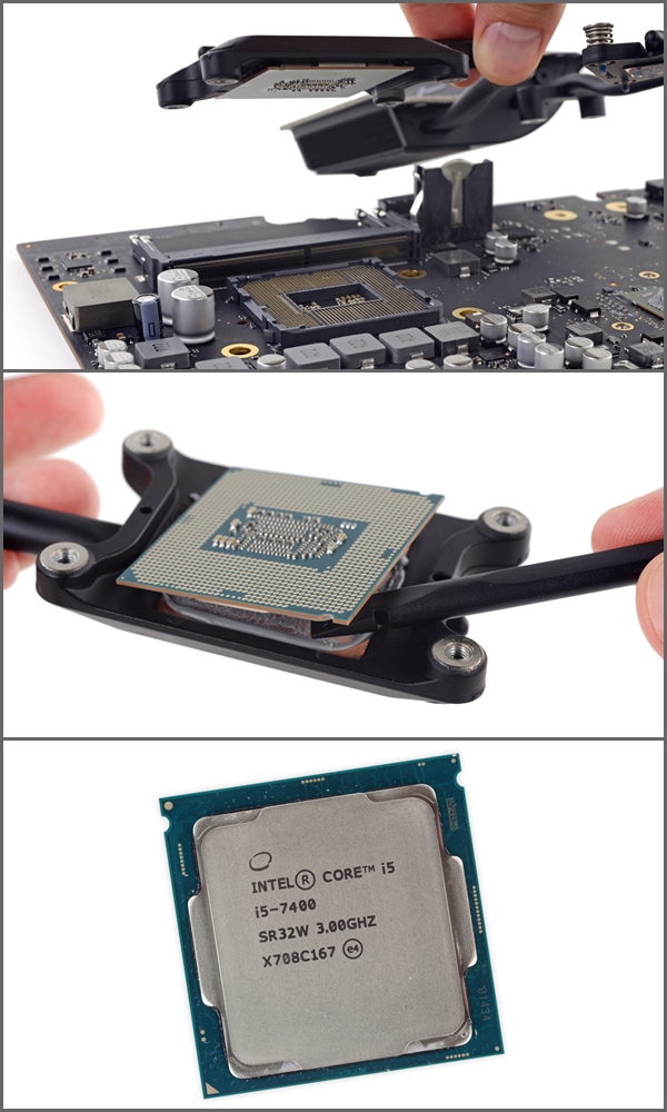 บน Logic Board มีซิงค์ระบายความร้อนติดอยู่ด้วย ซึ่งเมื่อแงะออกมาก็เป็นไปตามคาดครับ มันคือ CPU Intel SR32W Core i5-7400 Kaby Lake นั่นเอง และครั้งนี้มันไม่ได้เป็นเนื้อเดียวกับ Logic Board เหมือนรุ่นก่อนแล้ว แต่ก็เช่นเดียวกับ RAM ข้างบนนั่นคือเราต้องใช้ความพยายามพอสมควรในการแกะตัว CPU ออกมาเพราะมันยึดติดอยู่กับตัวซิงค์ด้วยกาวครับ