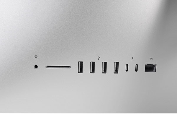 ด้านหลังเครื่องมีพอร์ตต่างๆ เรียงกันอยู่ ที่น่าสนใจคือมีพอร์ต Thunderbolt 3 ถึง 2 พอร์ตด้วยกัน ซึ่ง Thunderbolt 3 มีความเร็วในการรับ-ส่งข้อมูลอยู่ที่ 40Gbps ด้วยความเร็วระดับนี้ หากใช้ทั้ง 2 พอร์ตจะสามารถต่อพ่วงหน้าจอ 4K เพิ่มได้อีกถึง 4 ตัวเลยทีเดียว (แต่ตามสเปกบนหน้าเว็บจำกัดการต่อพ่วงจอ 4K ไว้แค่ 2 จอเท่านั้น)