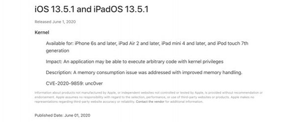 โดยเมื่อสัปดาห์ที่ผ่านมา ทาง Unc0ver ได้ปล่อยเครื่องมือสำหรับการ Jailbreak ตั้งแต่ iOS 11.0 ไปจนถึง iOS 13.5 และพบว่า มีผู้ใช้งานจำนวนไม่น้อยที่ทำการ Jailbreak และพบกับช่องโหว่ด้านความปลอดภัยมากมาย ทำให้ Apple ได้ปล่อยอัปเดต iOS 13.5.1 มาอุดช่องโหว่ดังกล่าว จึงแนะนำให้ผู้ใช้อุปกรณ์ iOS ทุกคนควรอัปเดต
