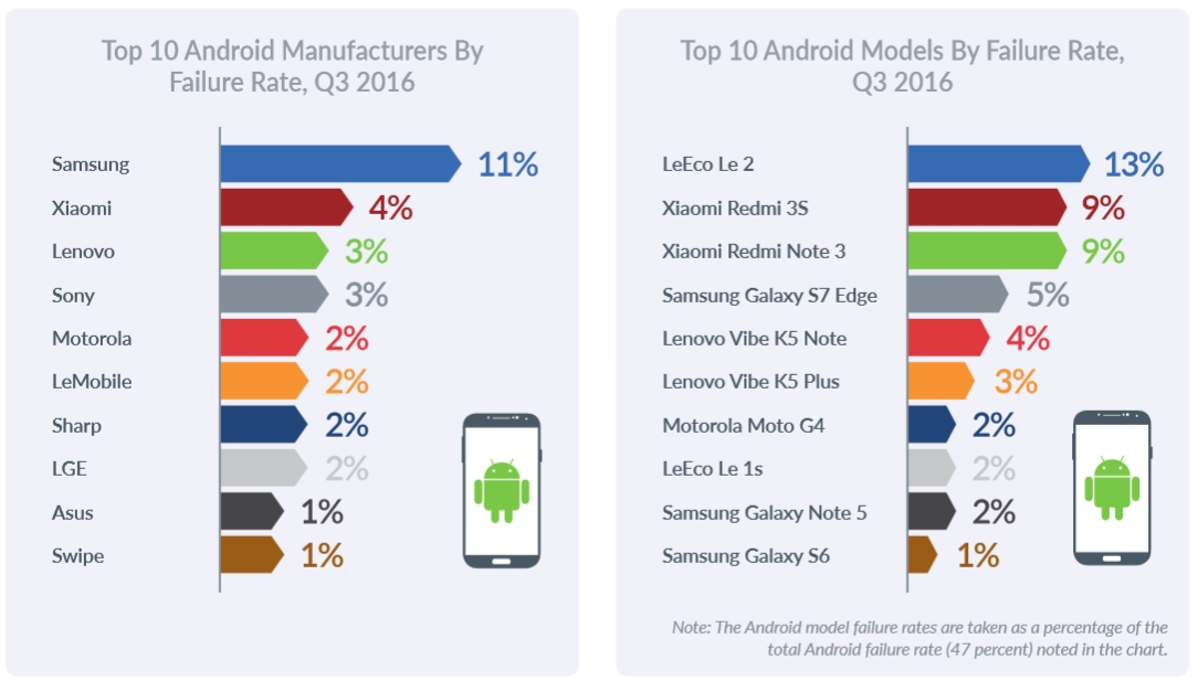 ส่วนระบบปฏิบัติการ Android แบรนด์ที่พบปัญหามากที่สุดได้แก่ Samsung ด้วยสัดส่วน 11% แต่จุดที่น่าสนใจอยู่ที่รุ่นที่พบปัญหาบ่อยสุดนั้นกลับไม่ใช่มือถือของซัมซุงแต่อย่างใด โดย LeEco Le 2 เรือธงจากฝั่งประเทศจีนเป็นรุ่นที่พบปัญหาด้านประสิทธิภาพการทำงานบ่อยสุดด้วยสัดส่วน 13% นอกจากนี้ Xiaomi Redmi 3s รวมไปถึง Xiaomi Redmi Note 3 มือถือจากแดนมังกรก็ติดอันดับด้วยเช่นเดียวกัน