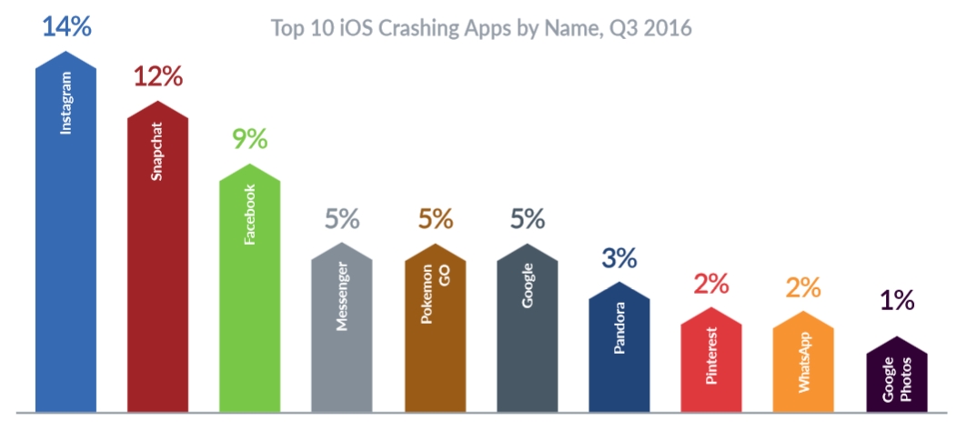 สำหรับแอปพลิเคชันที่เกิดปัญหาแอปเด้งบ่อยที่สุดของระบบ iOS นั้นยังคงเป็นแอปพลิเตชันสำหรับโลก Social Media อยู่เช่นเดิม ได้แก่ Instagram (14%) , Snapchat (12%) , Facebook (9%) และ Messenger (5%) ซึ่งมีจุดที่น่าสนใจอยู่ที่ Pokemon Go ก็เป็นหนึ่งในแอปพลิเคชันที่เด้งออกบ่อยด้วยเช่นเดียวกัน และยังเปิดเผยด้วยว่าเป็นแอปพลิเคชันที่ผู้คนใช้เวลาเล่นนานที่สุดเมื่อเทียบกับแอปต่างๆ อย่าง Facebook, Twitter หรือ Instagramee ด้วยเวลาเฉลี่ย 33 นาที และเนื่องด้วย Pokemon Go เกิดกระแสไวรัลและเป็นที่นิยมในกลุ่มผู้คน ก็เป็นปัจจัยที่ทำให้ตัวแอปเกิดอาการเด้งบ่อย และเซิฟเวอร์ก็ล่มบ่อยด้วยเช่นเดียวกัน