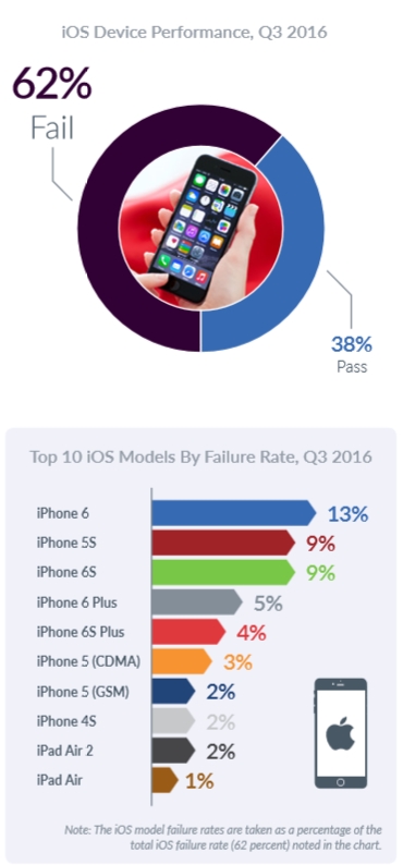 นอกจากนี้ยังมีการค้นพบด้วยว่า ในช่วงไตรมาสที่ผ่านมา iOS เกิดปัญหาด้านประสิทธิภาพการใช้งาน (Failure Rate) เพิ่มสูงขึ้นเป็น 62% โดยรุ่นที่พบปัญหาบ่อยสุดนั้นยังคงเป็นรุ่นเดิมที่ครองแชมป์เมื่อครั้งที่แล้วอย่าง iPhone 6 อย่างไรก็ดี Blancco Technology Group ระบุว่าครั้งนี้เป็นครั้งที่ 2 ที่อุปกรณ์ iOS มีค่าปัญหาประสิทธิภาพการทำงานที่มากกว่าระบบ Android โดยปัจจัยหลักที่ส่งผลนั้นยังคงเป็น iOS 10 ซึ่งสื่อต่างประเทศรวมทั้งบล็อกเกอร์หลายสำนักระบุว่า ทำให้ไอโฟนช้าลงโดยเฉพาะบน iPhone 6 และ iPhone 5s นอกจากนี้ The Guardian สื่อรายใหญ่จากต่างประเทศก็ได้ทำการเปิดเผยออกมาเช่นกันว่า การอัปเดต iOS 10 ทำให้อุปกรณ์ของผู้ใช้บางส่วนเกิดอาการ Brick หรือค้างและเปิดไม่ติดอีกด้วย ทำให้ต้อง restore ผ่านทาง iTune เพื่อแก้ไขอาการดังกล่าว