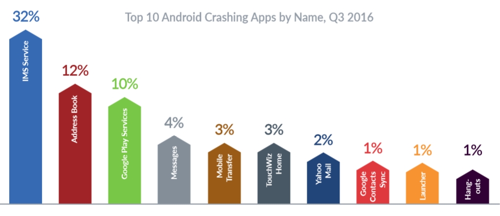 ในขณะที่ฝั่ง Android แอปพลิเคชันที่เกิดปัญหาแอปเด้งบ่อย 3 อันดับแรกค่อนข้างจะแตกต่างกับระบบ iOS อย่างเห็นได้ชัด เพราะเป็นแอปพลิเคชันที่ล้วนแล้วแต่เกี่ยวข้องกับตัวระบบ นอกจากนี้ทางผู้วิจัยยังเปิดเผยออกมาด้วยว่า เมื่อเร็วๆ นี้ผู้ใช้ระบบปฏิบัติการ Android 5.0 และ 5.1 เริ่มพบข้อความ error ที่แจ้งเตือนว่า "Google Play Services has stopped" กันบ้างแล้ว สำหรับปัจจัยที่ทำให้เกิดอาการดังกล่าวเนื่องมาจากปัญหาด้านการเชื่อมต่ออินเทอร์เน็ตที่หยุดทำงานไป นอกจากนี้การที่ผู้ใช้ดาวน์โหลด Google Play Service เวอร์ชันเก่ามาติดตั้งก็ทำให้เกิดปัญหานี้เช่นเดียวกัน