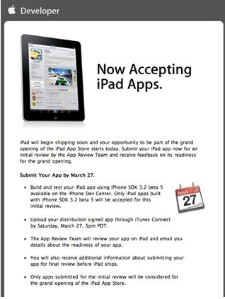หากนักพัฒนาโปรแกรม ต้องการให้ Apps ของตัวเองมีให้โหลดได้ในวันวางขาย(3 เมษายน) นักพัฒนาฯต้องส่ง Apps ให้ทางแอปเปิ้ลภายในวันที่ 27 มีนาคม นี้ครับ