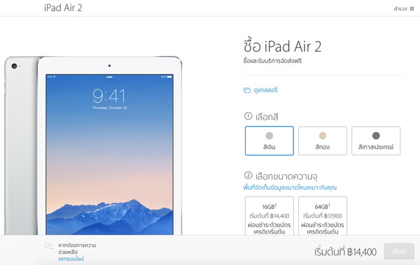 หลังจากที่ แอปเปิล ได้เปิดตัว iPad Pro หน้าจอ 9.7 นิ้ว ล่าสุด iPad รุ่นก่อนหน้าอย่าง iPad Air 2 ได้มีการปรับราคาลงมาแล้ว จากราคาเดิมที่ 16,900 บาท สำหรับ Wi-Fi ความจุ 16 GB เหลือเพียง 14,400 บาท ส่วนรุ่น Wi-Fi + Cellular เริ่มต้นที่ 18,900 บาท และตัดรุ่นความจุ 128 GB ออกแล้ว