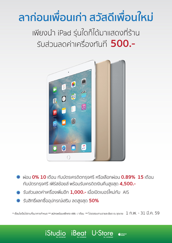 เพียงนำ iPad รุ่นใดก็ได้มาเเสดงที่ร้าน รับส่วนลดค่าเครื่องทันที 500 บาท