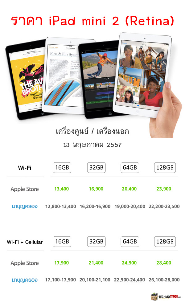 วางจำหน่ายในไทยอย่างเป็นทางการครับ กับ iPad mini 2 (ไอแพด มินิ 2) รุ่นหน้าจอ Retina display ซึ่งเปิดตัวอย่างเป็นทางการ เมื่อวันที่ 22 ตุลาคม 2556 ที่ผ่านมา ซึ่ง Apple Online Store เคาะ ราคา iPad mini 2 Retina display เริ่มต้นที่ 13,400 บาท สำหรับรุ่น Wi-Fi ความจุ 16GB ซึ่งล่าสุด ได้วางจำหน่าย iPad mini 2 รุ่น Wi-Fi + Cellular แล้วเช่นกัน ราคาเป็นดังนี้ครับ
