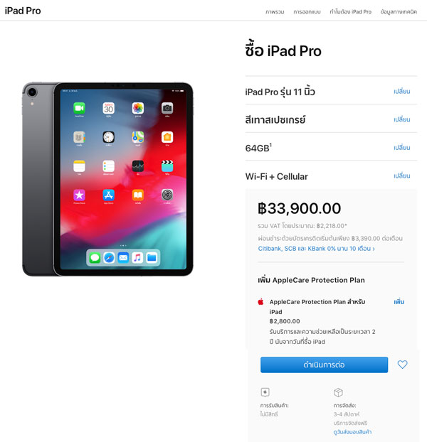 โดยในหน้า Apple Online Store นั้น ผู้ที่สนใจสามารถสั่งซื้อ iPad Pro (2018) รุ่น Wi-Fi + Cellular ซื้อใช้เวลาในการจัดส่งราว ๆ 3-4 สัปดาห์ และข้อสังเกตก็คือ ยังไม่เปิดรับสินค้าที่ Apple Iconsiam ด้านผู้ให้บริการเครือข่ายทั้ง 3 ใหญ่ในไทย ก็ยังไม่เปิดเผยราคาและโปรโมชั่นของ iPad Pro (2018) รุ่น Wi-Fi + Cellular ในตอนนี้ (ณ ช่วงเวลาที่เขียนข่าว)