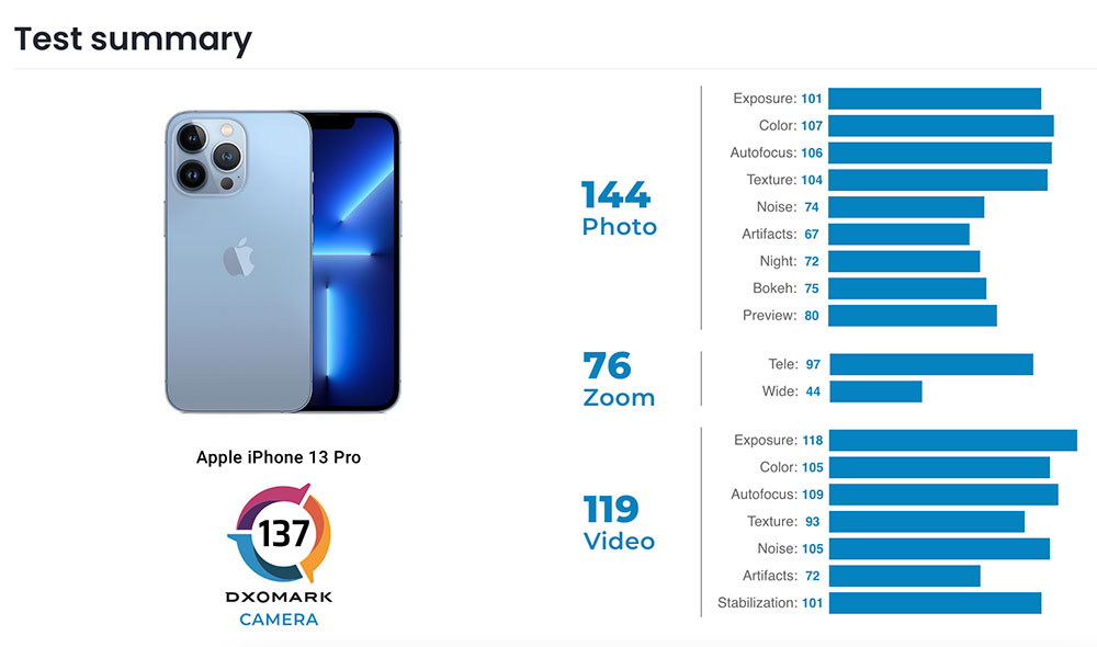 ในส่วนของภาพนิ่ง iPhone 13 Pro ทำได้ถึง 144 คะแนน ซึ่งมีจุดเด่นในเรื่องของ Exposure ที่มีความแม่นยำ, ค่า White Balance มีความสมดุล, การเรนเดอร์สีผิวทำได้ดีในทุกสภาพแสง, ระบบออโตโฟกัสทำได้รวดเร็ว แม่นยำ, เก็บรายละเอียดของภาพได้ดีทั้งในที่ร่มและกลางแจ้ง