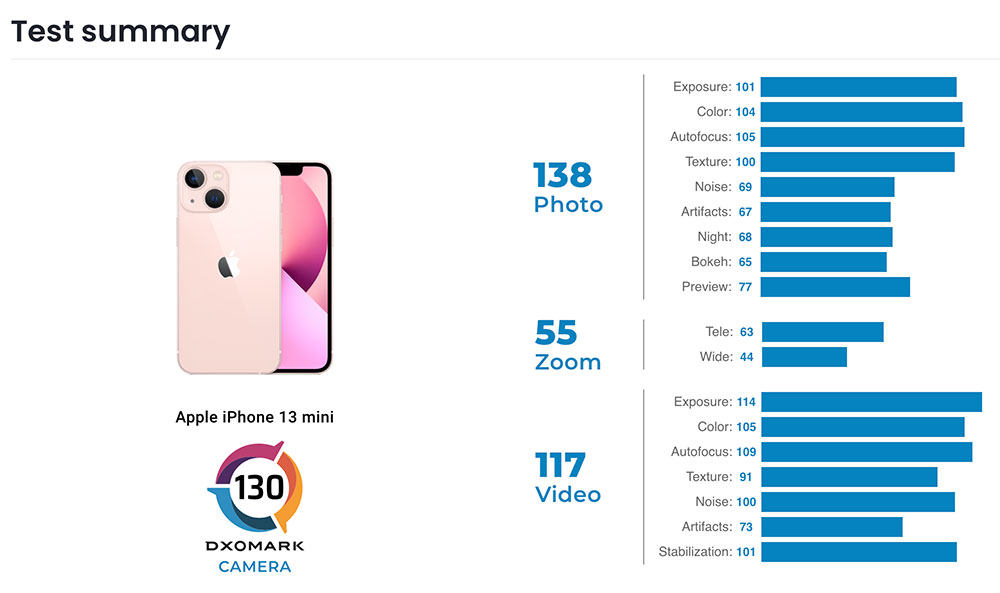 ด้าน iPhone 13 mini ไอโฟนไซซ์เล็ก ทาง DxoMark ให้คะแนนทดสอบรวมที่ 130 คะแนน เท่ากับ iPhone 12 Pro Max รุ่นปีที่แล้ว โดยแบ่งเป็นคะแนนภาพนิ่ง 138 คะแนน และคะแนนวิดีโอ 117 คะแนน ซึ่งได้คะแนนดีกว่า iPhone 12 Pro Max แต่เป็นรองในเรื่องของการซูม เนื่องจาก iPhone 13 mini ไม่มีเลนส์ Telephoto นั่นเอง