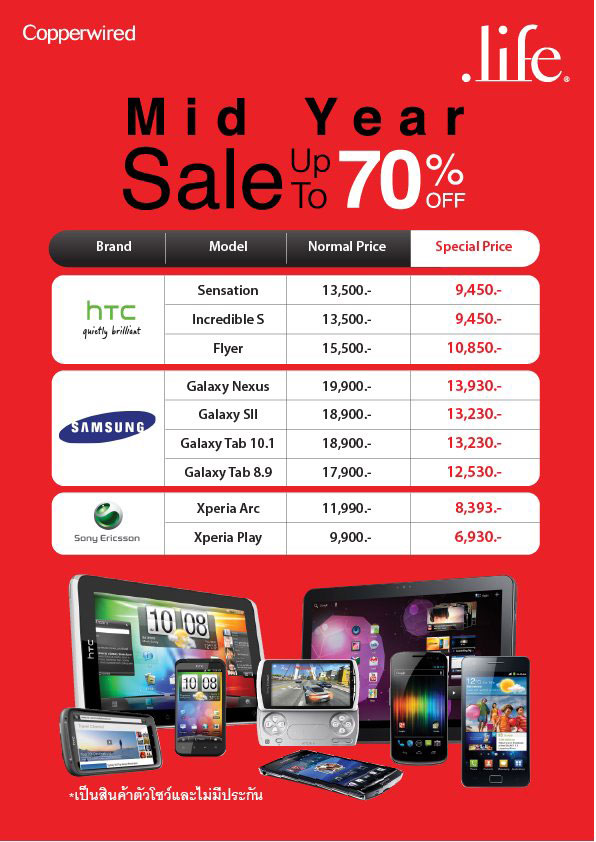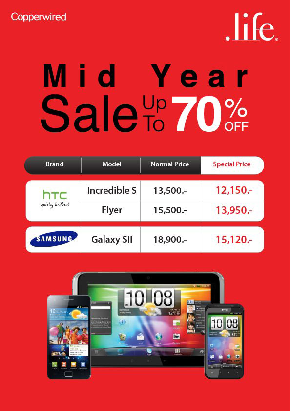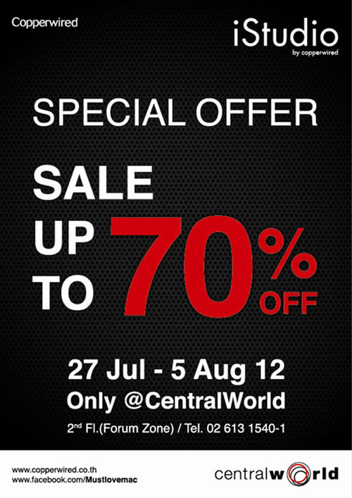 [28-กรกฏาคม-2555] วันนี้ เว็บไซต์เทคโมบล็อค มีข่าวดีสำหรับสาวก Apple มาบอกกล่าวกันครับ เมื่อร้าน iStudio by Copperwired สาขาเซ็นทรัลเวิลด์ชั้น 2 และ Dotlife สาขาเซ็นทรัลลาดพร้าวชั้น 3 ได้นำผลิตภัณฑ์ Apple ออกมาลดราคาแบบพิเศษสุดๆ กับโปรโมชั่น Mid Year Sale โดยลดสูงสุดถึง 70% ทั้ง ไอโฟน 4 (iPhone 4 ลดราคา), ไอโฟน 4S (iPhone 4S ลดราคา), ไอแพด 2 (iPad 2 ลดราคา), The new iPad (iPad 3) และอื่นๆ เรียกได้ว่า เห็นราคากันแล้ว มีสิทธิ์ได้เสียเงินซื้อกันอย่างแน่นอนครับ