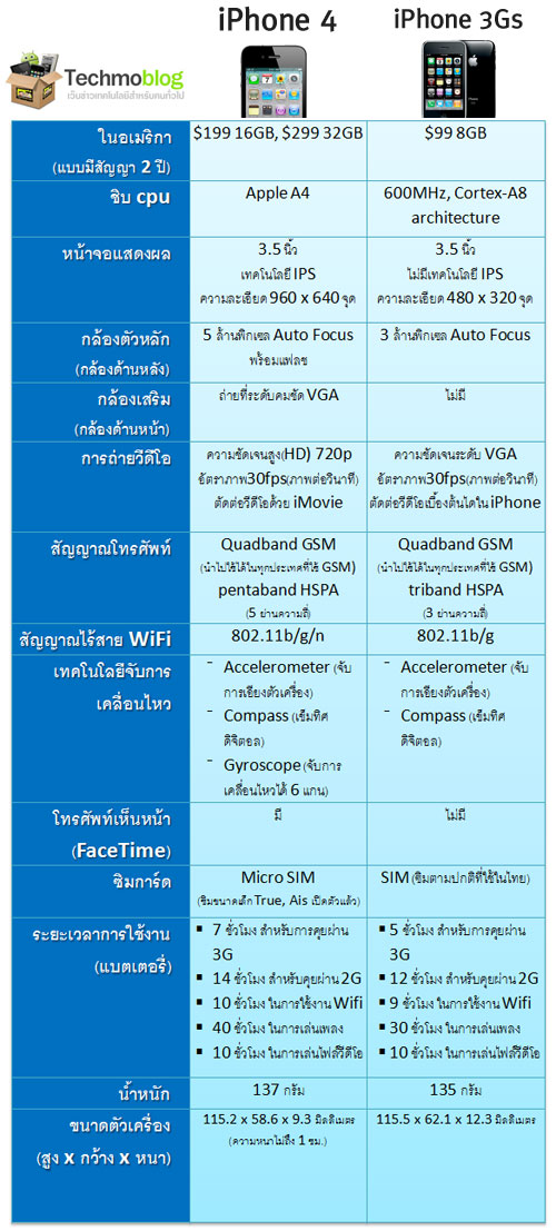 รายละเอียดความแตกต่างของ iPhone 4 กับ iPhone 3Gs ไปแล้วนะครับ แต่มาทบทวนกันอีกทีว่า 2 รุ่นนี้ ต่างกันยังไง โดยผมไปเอาตารางข้อมูลเปรียบเทียบให้ดูครับ
