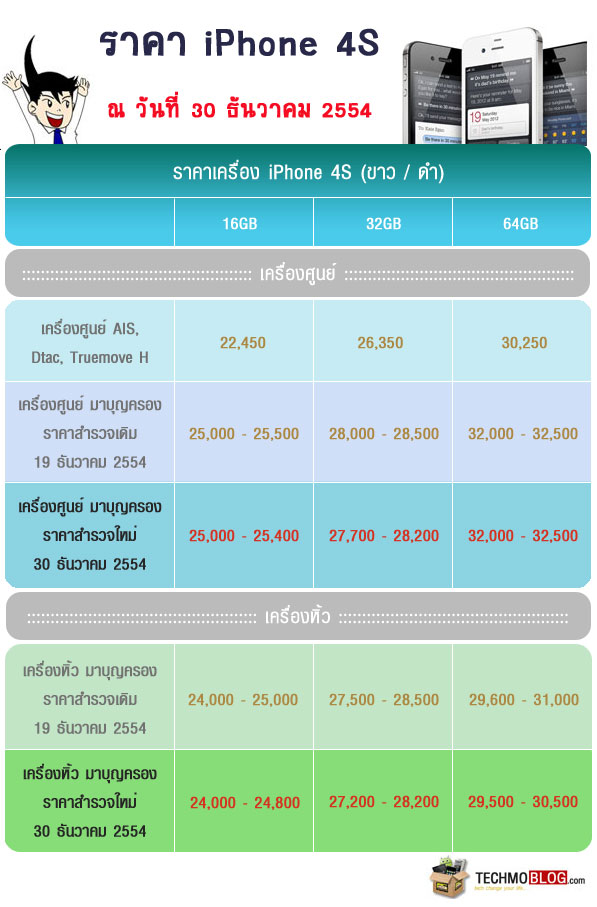 สำหรับการสำรวจ ราคา ไอโฟน 4S (iPhone 4S) หลังจากที่ทางศูนย์ Dtac, AIS และ Truemove H เปิดจำหน่ายแล้ว พบว่า ราคา ไอโฟน 4S (iPhone 4S) เครื่องหิ้วแบบ Unlock ได้มีการปรับราคาลงแล้วนะครับ ซึ่งเครื่อง Unlock เท่าที่สำรวจ จะมีเครื่องหิ้วทั้งจากฮ่องกง และสิงคโปร์ รวมไปถึงเครื่อง US ด้วย โดย ไอโฟน 4S (iPhone 4S) รุ่น 16GB เครื่องหิ้วนั้น เริ่มต้นที่ประมาณ 25,000 บาท แต่ถึงแม้ว่า จะมีการปรับราคาลดลง แต่ราคาก็ยังสูงอยู่ดีครับ