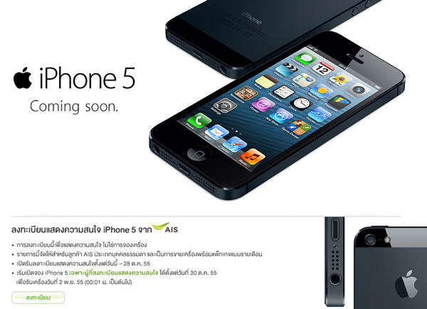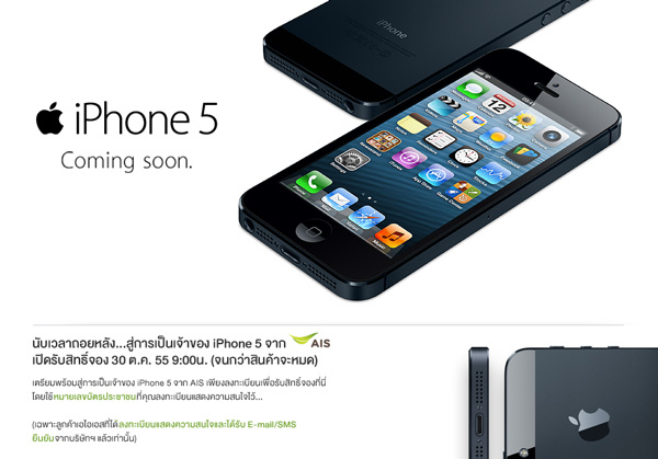 อัพเดท! ล่าสุด [28-ต.ค.-55] ทาง AIS ได้ขึ้นข้อความบนหน้าเว็บไซต์ว่า นับเวลาถอยหลังสู่การเป็นเจ้าของ iPhone 5 จาก AIS เปิดสิทธิ์รับจอง 30 ต.ค. 55 เวลา 9.00 น. (จนกว่าสินค้าจะหมด) โดยใช้หมายเลขบัตรประชาชนที่คุณลงทะเบียนแสดงความสนใจไว้ และเฉพาะผู้ที่ได้รับอีเมล และ SMS ยืนยันแล้วเท่านั้นครับ