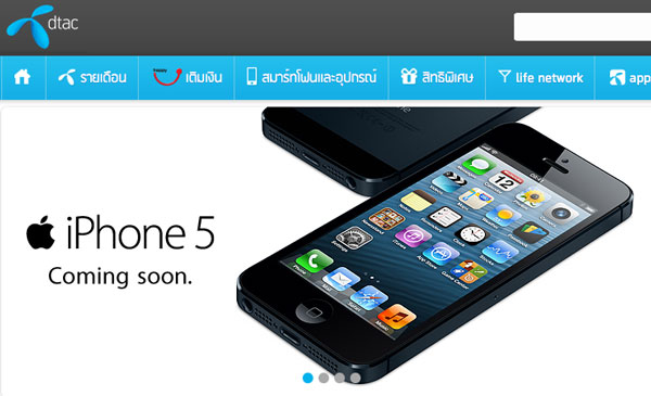 สำหรับ Dtac นั้น ก็ได้ขึ้นหน้าเว็บเป็นรูป iPhone 5 (ไอโฟน 5) เช่นเดียวกันครับ แต่ไม่มีรายละเอียดให้ลงทะเบียน หรือเปิดจองเหมือนกับ 2 เครือข่ายข้างต้นแต่อย่างใด มีเพียงแต่คำว่า Coming soon เท่านั้น คาดว่า เร็วๆ นี้ ทาง Dtac คงจะมีความเคลื่อนไหวกันอย่างแน่นอนครับ