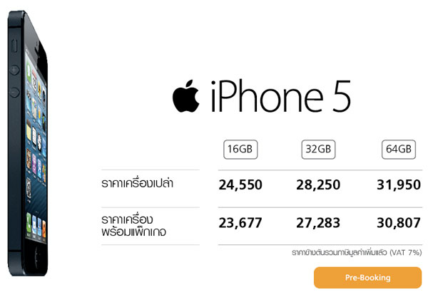 - iPhone 5 16GB เครื่องเปล่า 24,550 บาท เครื่องพร้อมแพ็กเกจ 23,677 บาท