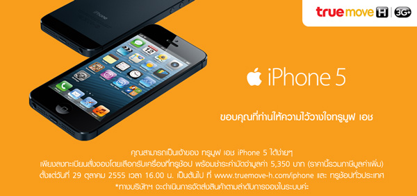 อัพเดท (1) ! [28-ต.ค.-55] ทาง Truemove H ได้ขึ้นข้อความบนหน้าเว็บไซต์ว่า สามารถเป็นเจ้าของ ทรูมูฟ เอช iPhone 5 ได้ง่ายๆ เพียงลงทะเบียนสั่งจองโดยเลือกรับเครื่องที่ทรูช็อป พร้อมชำระค่ามัดจำมูลค่า 5,350 บาท (รวมภาษีแล้ว) ตั้งแต่วันที่ 29 ตุลาคม 2555 เวลา 16.00 น. เป็นต้นไป ที่ www.truemove-h.com/iphone และทรูช้อปทั่วประเทศครับ