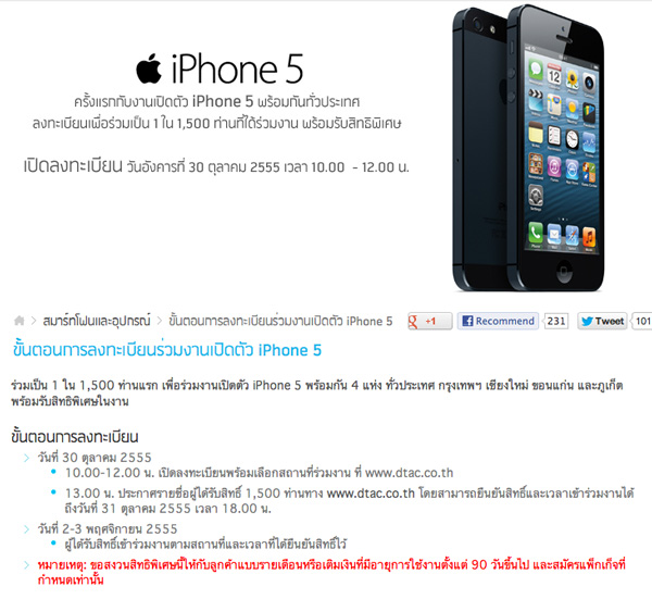 - เริ่มเปิดจอง iPhone 5 เฉพาะผู้ที่ลงทะเบียนแสดงความสนใจ ได้ตั้งแต่วันที่ 30 ต.ค. 55 เพื่อรับเครื่องวันที่ 2 พ.ย.55 (00.01 น. เป็นต้นไป)