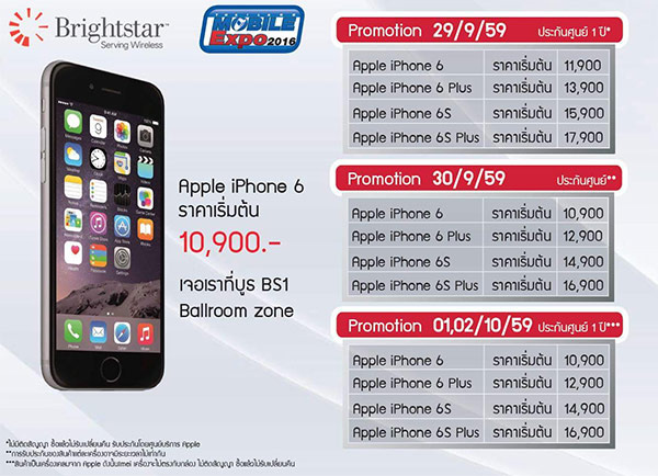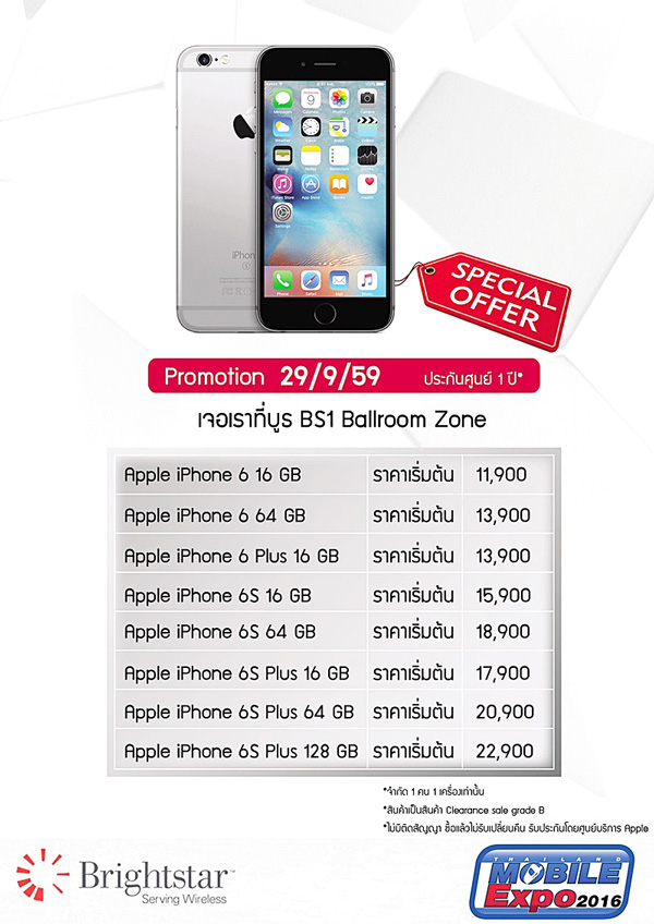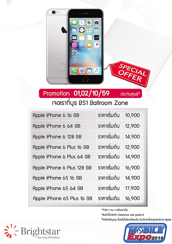 เป็นโปรโมชั่นที่กำลังได้รับความสนใจอยู่ในขณะนี้ กับบูธ Brightstar ที่นำ iPhone 6, iPhone 6 Plus, iPhone 6S และ iPhone 6S Plus มาลดราคาล้างสต็อกแบบพิเศษสุด ๆ เริ่มต้นเพียง 10,900 บาทเท่านั้น แต่มีเงื่อนไขก็คือ เครื่องที่นำมาลดราคานี้ เป็นเครื่องเคลม และเครื่องเกรด B ฉะนั้น ถ้าหากไม่กังวลเรื่องตัวเครื่องแบบใหม่แกะกล่อง สินค้าขายตามสภาพ ก็ถือว่า น่าสนใจมากเลยทีเดียว โดยราคาในแต่ละวัน เป็นดังนี้