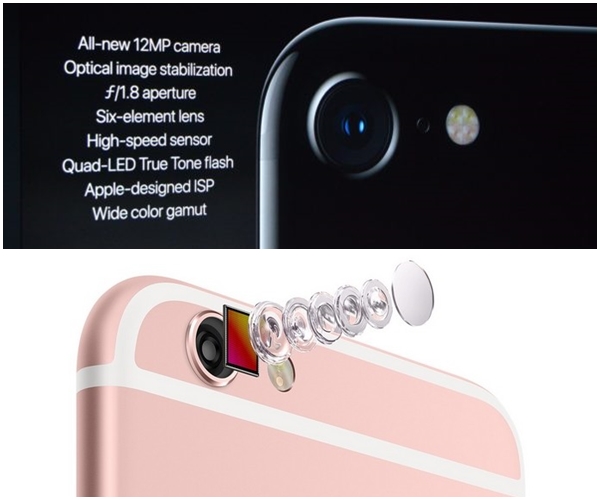 กล้อง iSight ของ iPhone 7 เป็นกล้องแบบ Single-Camera ความละเอียด 12 ล้านพิกเซล รูรับแสงกว้างสูงสุด F/1.8 พร้อมไฟแฟลชแบบ Quad-LED (ไฟแฟลช 4 ดวง) สว่างกว่าเดิม 50%, กล้องด้านหน้า ความละเอียด 7 ล้านพิกเซล รูรับแสง F/2.2 และมีระบบกันสั่นแบบ OIS iPhone 6s มีกล้องหลังความละเอียด 12 ล้านพิกเซลเท่ากัน แต่เป็นไฟแฟลช 2 ดวง Dual-Tone รูรับแสงกว้าง F/2.2 และกล้องหน้าความละเอียด 5 ล้านพิกเซล สำหรับการบันทึกวิดีโอความละเอียดสูง ทั้ง 2 รุ่นสามารถรองรับการถ่ายวิดีโอบนความละเอียดสูงสุดระดับ 4K ได้ที่ 30 เฟรมต่อวินาที จากตรงนี้จะเห็นได้ชัดเจนว่า iPhone 7 มีคุณสมบัติเหนือกว่า iPhone 6s พอสมควรทีเดียว