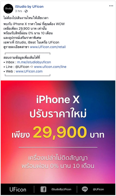 โดยในหน้าแฟนเพจของ iStudio by UFicon ได้มีการประกาศ iPhone X ราคาใหม่ เหลือเพียง 29,900 บาท ซึ่งเป็นราคาเครื่องเปล่า ไม่ติดสัญญา เช่นเดียวกับทาง iStudio by SPVi ก็ได้ประกาศปรับราคา iPhone X เหลือ 29,900 บาทเช่นกัน แถมรับสิทธิ์ผ่อน 0% อีกด้วย