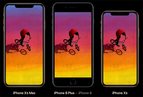 iPhone XS และ iPhone XS Max เป็นรุ่นสานต่อของ iPhone X ซึ่งมาพร้อมกับดีไซน์จอบาก ไร้ขอบ ไร้ปุ่ม Home โดย iPhone XS มาพร้อมกับหน้าจอขนาด 5.8 นิ้ว ส่วน iPhone XS Max มาพร้อมกับหน้าจอขนาด 6.5 นิ้ว ซึ่งทั้ง 2 รุ่นเป็นหน้าจอแบบ OLED รองรับทั้ง Dolby Vision และ HDR10 พร้อมอัตราส่วนคอนทราสต์สูงถึง 1,000,000:1 โดย iPhone XS Max มีขนาดจอใหญ่ที่สุดเท่าที่เคยมีมาบน iPhone แต่ขนาดตัวเครื่องใกล้เคียงกับ iPhone 8 Plus