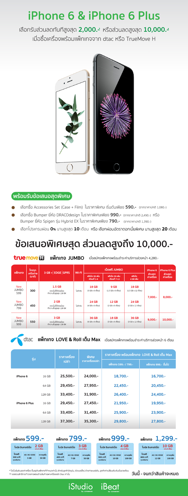 iStudio iBeat by comseven ให้คุณเป็นเจ้าของ iPhone 6 และ iPhone 6 Plus ได้ง่าย ๆ เลือกรับส่วนลดทันทีสูงสุด 2,000.- หรือส่วนลดสูงสุด 10,000.- เมื่อซื้อเครื่องพร้อมแพ็กเกจ จาก dtac หรือ TrueMove H