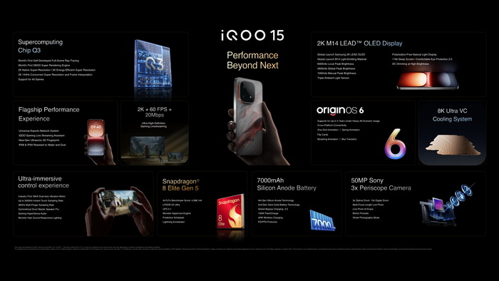 iQOO 15 พร้อมมอบประสิทธิภาพเกมมิ่งระดับพีซีบนสมาร์ตโฟนด้วยขุมพลังระดับแนวหน้า Snapdragon® 8 Elite Gen 5 ผสานการทำงานกับ Supercomputing Chip Q3 เพื่อประสบการณ์ที่คมชัดและลื่นไหลที่สุด พร้อมรองรับเกมครบทุกแนว เล่นได้เต็มที่ยิ่งขึ้น เร็วขึ้น ภาพสวยขึ้น บนหน้าจอแสดงผลระดับท็อป iQOO × Samsung 2K LEAD OLED ความละเอียด 2K 144Hz ชัดใส สบายตา แม้ใช้งานกลางคืน บนความสว่างสูงสุด 6000nits รับประกันความลื่นไหลในทุกจังหวะเกมแบบไม่ต้องพักชาร์จนาน ด้วยแบตเตอรี่ BlueVolt 7000mAh ผนวกกับระบบชาร์จไวแบบใช้สาย 100W FlashCharge ชาร์จไวไร้สาย 40W และเทคโนโลยีระบายความร้อนที่ใหญ่ที่สุดในวงการอย่าง VC Vapor Chamber 8,000 ตร.มม.