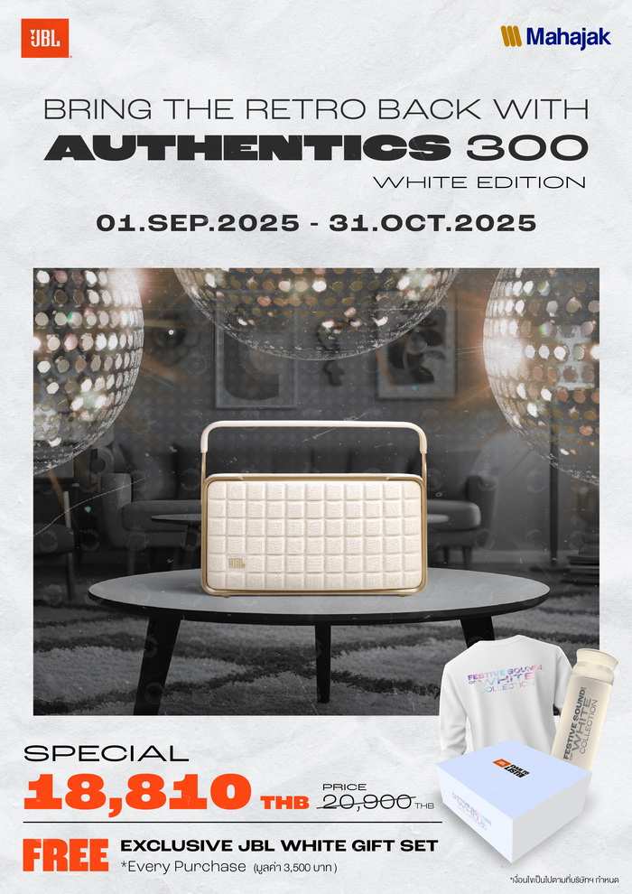 บริษัท มหาจักรดีเวลอปเมนท์ จำกัด ผู้นำเข้าและจัดจำหน่ายผลิตภัณฑ์ JBL อย่างเป็นทางการในประเทศไทย จัดแคมเปญพิเศษเอาใจแฟน ๆ เสียงเพลงและดีไซน์สุดคลาสสิก ด้วยโปรโมชั่นสำหรับ JBL Authentics 300 White Edition ลำโพงไร้สายที่ผสานกลิ่นอายเรโทรเข้ากับความโมเดิร์นได้อย่างลงตัว
