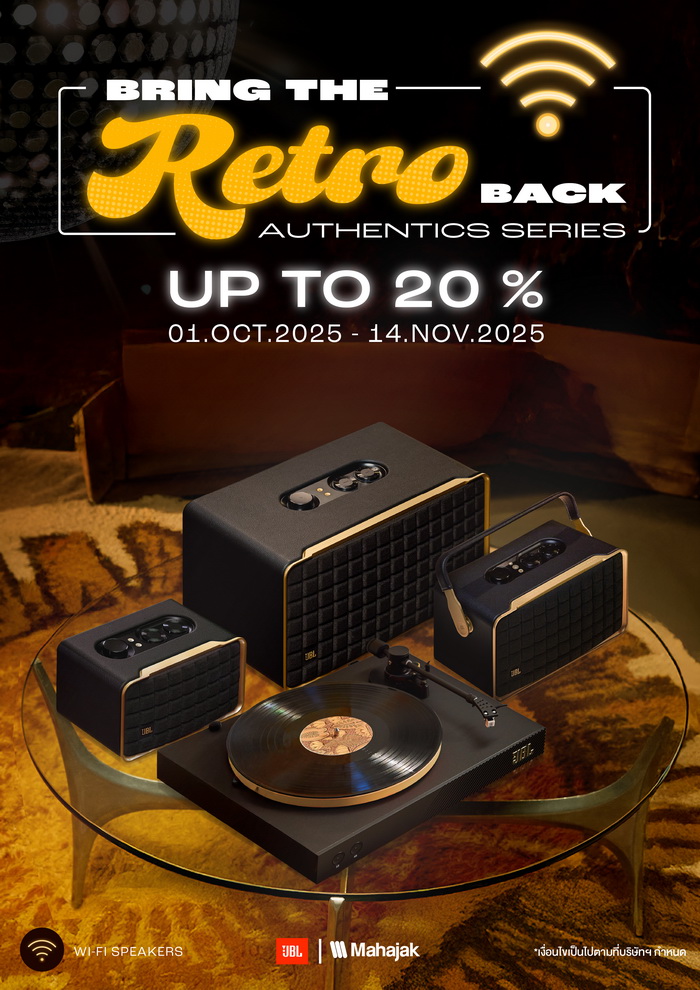 บริษัท มหาจักรดีเวลอปเมนท์ จำกัด ผู้นำเข้าและจัดจำหน่ายผลิตภัณฑ์เครื่องเสียง JBL อย่างเป็นทางการในประเทศไทย ชวนคอเพลงและผู้หลงใหลในงานดีไซน์แนววินเทจ และเรโทรย้อนประสบการณ์กลับมาสัมผัสความคลาสสิกในแบบยุค 70’s ผ่านลำโพงระดับพรีเมียมตระกูล JBL Authentics Series ภายใต้แคมเปญ “Bring the Retro Back” พร้อมมอบส่วนลดพิเศษสูงสุด 20% ระหว่างวันที่ 1 ตุลาคม – 14 พฤศจิกายน 2568 เท่านั้น