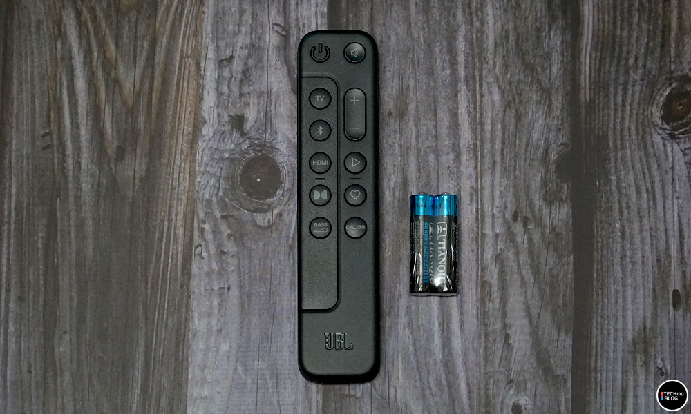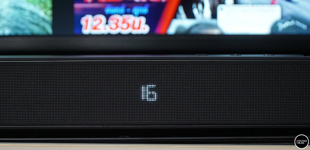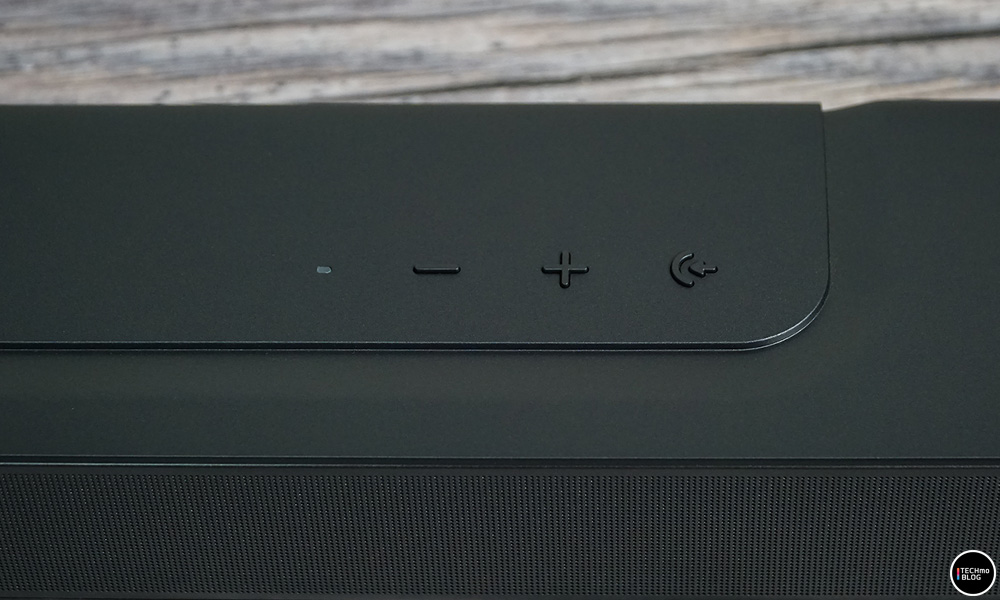 ตรงกลางด้านบนของตัวเครื่อง จะเป็นโลโก้ JBL พร้อมไมโครโฟนสำหรับฟีเจอร์ Easy Sound Calibration ปรับจูนเสียงของซาวด์บาร์