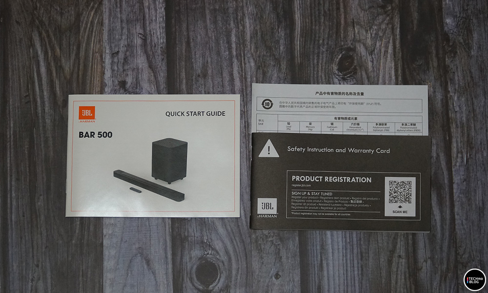 กล่องผลิตภัณฑ์ของ JBL BAR 500 วัดขนาดได้ 1,105 x 370 x 475 มม. น้ำหนักกล่องอยู่ที่ 16.2 กิโลกรัม ซึ่งภายในบรรจุลำโพงซาวด์บาร์ JBL BAR 500, ซับวูฟเฟอร์ และอุปกรณ์ต่าง ๆ ประกอบด้วย