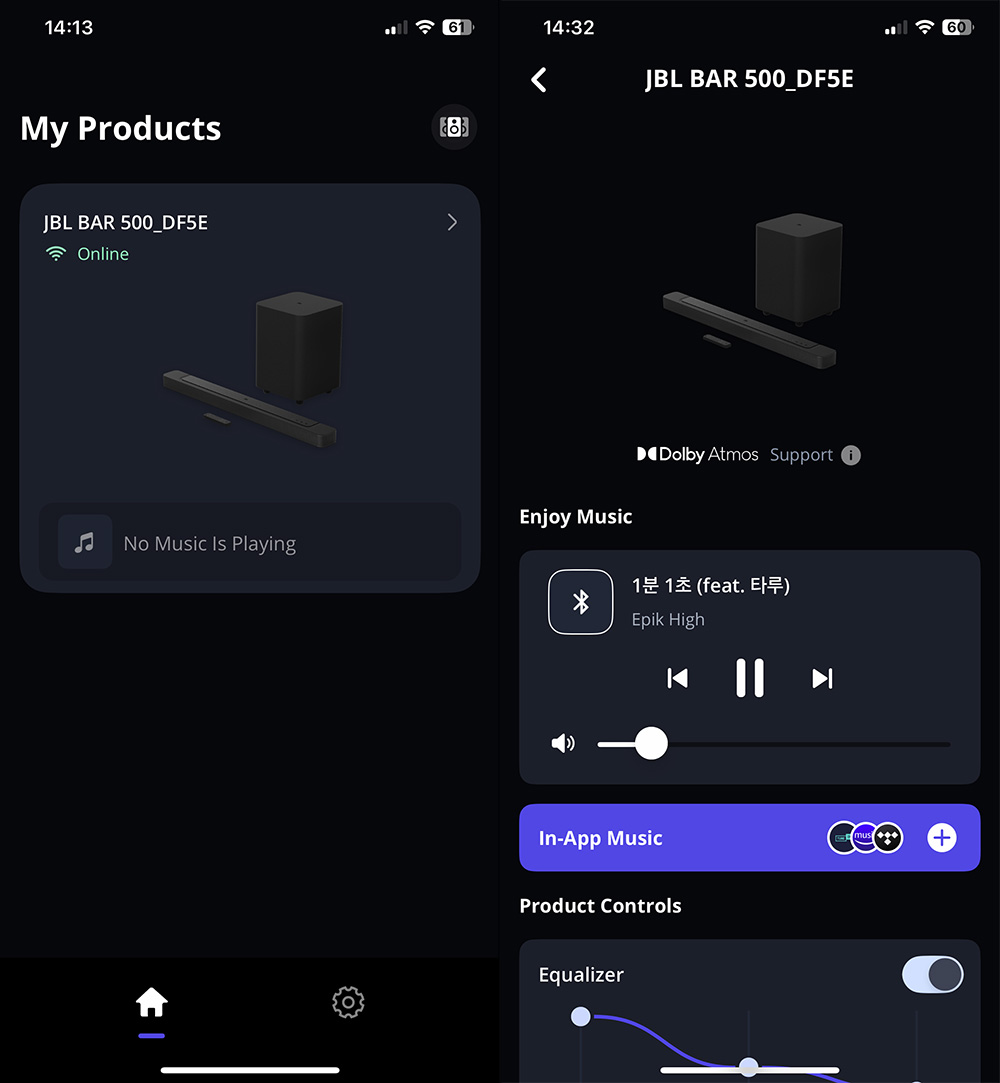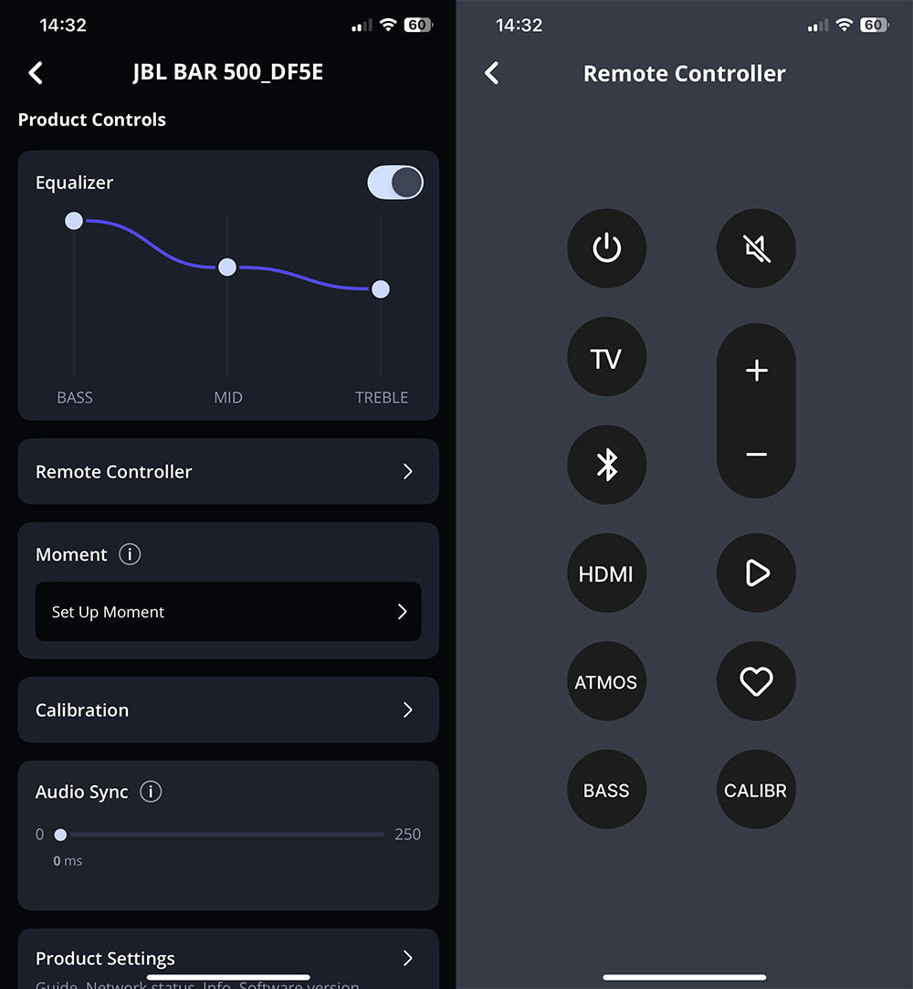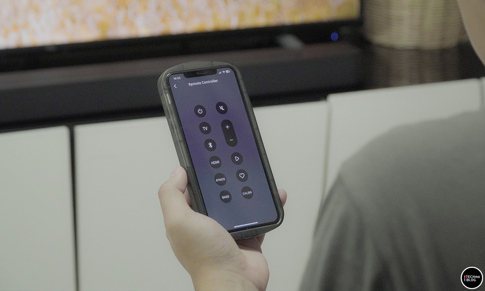 นอกจากนี้ JBL BAR 500 ยังสามารถใช้งานร่วมกับแอปพลิเคชัน JBL One ควบคุมการทำงานต่าง ๆ ของซาวด์บาร์ได้ด้วยปลายนิ้ว โดยเฉพาะอย่างยิ่งถ้าหากเป็นคนขี้ลืม จำไม่ได้ว่าวางรีโมตไว้ที่ไหน ก็สามารถหยิบสมาร์ตโฟนแล้วเปิดแอป JBL One ใช้งานได้เลย เพราะภายในแอปจะมีฟีเจอร์ Remote Controller มาให้ด้วย แต่จากการทดสอบใช้งานพบว่า มีดีเลย์บ้างเล็กน้อย