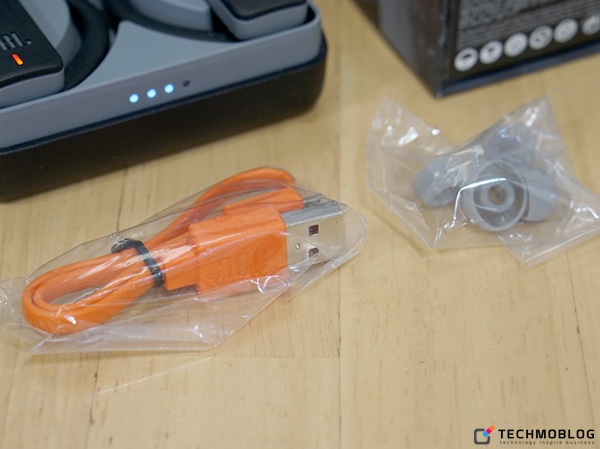 ในกล่องผลิตภัณฑ์นั้น จะประกอบไปด้วย สาย USB และจุกยางให้เลือกทั้งหมด 3 ขนาด ได้แก่ S, M และ L ที่ผู้ใช้สามารถเลือกเปลี่ยนได้ โดยรุ่นนี้ไม่มี Adapter สำหรับชาร์จไฟมาให้ แต่สามารถใช้ Adapter ของสมาร์ทโฟนได้เช่นกัน