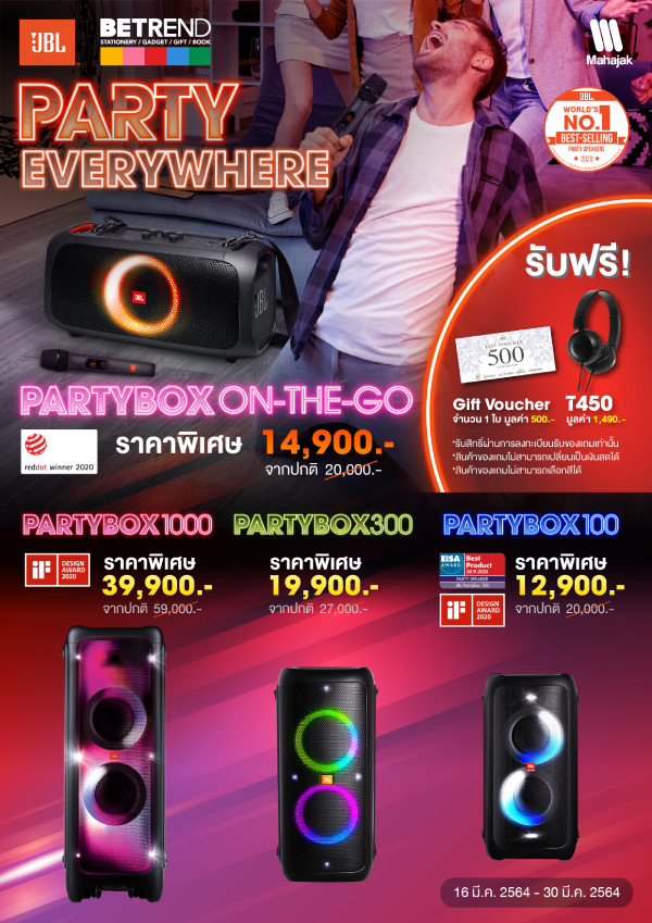 - เมื่อซื้อสินค้า Partybox Serie รุ่นใดก็ได้ จะได้รับ Gift voucher 500 บาท (เฉพาะ Betrend สาขาสยามพารากอน ระหว่างวันที่ 16 – 30 มีนาคม 2564)