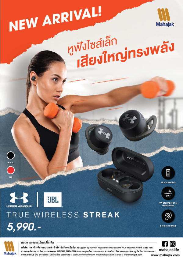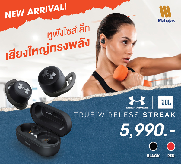 หูฟังออกกำลังกาย True Wireless ที่ออกแบบมาเพื่อแฟนๆ ของ Under Armour โดยเฉพาะ ด้วยดีไซน์ที่มีขนาดเล็ก น้ำหนักเบาพิเศษ และสามารถปรับขนาดให้พอดีกับหูผู้ใส่ ทำให้สามารถสวมใส่ได้ทั้งผู้ชายและผู้หญิง มาพร้อมกับพลังเสียง JBL Charged Sound ให้เบสที่หนักแน่นตามเอกลักษณ์ของ JBL ตัวหูฟังเป็นแบบ In Ear ใช้งานง่าย ตอบโจทย์สายสปอร์ตสุดๆ ด้วยน้ำหนักที่เบา สวมใส่แน่น กระชับ สบายหูไม่ลื่นหลุดง่าย ไม่ว่าจะออกกำลังกายแนวไหน มาพร้อมคุณสมบัติ UA Storm กันน้ำระดับ IPX7 กันน้ำ กันเหงื่อ ได้สบาย รวมถึงฟังก์ชั่น Ambient Aware และ Talk Thru ช่วยให้ได้ยินเสียงรอบข้างระหว่างใช้งาน ที่จะช่วยให้เราได้ยินเสียงสิ่งแวดล้อมภายนอกได้ด้วย สามารถใช้งานได้ยาวนานถึง 18 ชั่วโมง เชื่อมต่อไร้สายด้วย Bluetooth 5.0 ทำให้เชื่อมต่อผ่าน Device ได้อย่างเสถียรมากขึ้น ด้วยระบบ All-Access Touch Control ทำให้สะดวกต่อการใช้งานเพียงแค่ Touch พร้อม Map Myrun Premium Membership ฟรี 12 เดือน