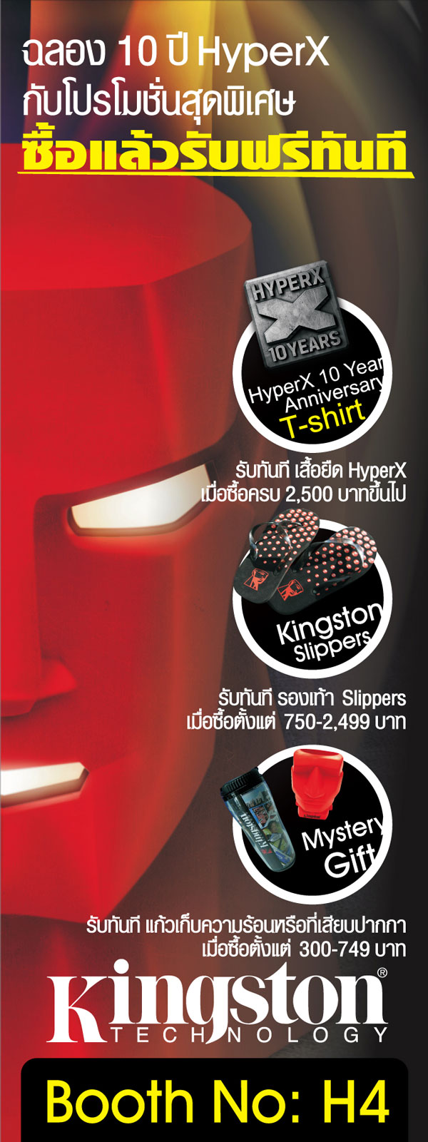 เพียงแวะมาที่บู๊ทคิงส์ตันและซื้อสินค้าครบ 300 บาทขึ้นไป รับทันทีของสมนาคุณในงานบิ๊ก เฟสติวัล เมื่อซื้อสินค้าคิงส์ตันครบตั้งแต่ 300-749 บาท รับสิทธิ์ร่วมลุ้นจับรางวัลชิงของขวัญสุดพิเศษ เช่น แก้วเก็บอุณหภูมิคิงส์ตัน พัดลมมือถือสุดเท่ห์ และโมเดล เรดเฮด โดดเด่นกับสัญลักษณ์คิงส์ตัน และเมื่อซื้อสินค้าครบตั้งแต่ 750-2,499 บาท รับรองเท้าสลิปเปอร์ใส่ในบ้านทันที 1 คู่ สำหรับการซื้อสินค้าครบตั้งแต่ 2,500 บาทขึ้นไป รับทันทีเสื้อยืดฉลองครบรอบ 10 ปี HyperX
