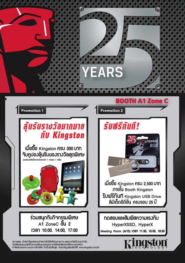 ร่วมเฉลิมฉลองครบ 25 ปี ไปกับคิงส์ตัน พร้อมสัมผัสประสบการณ์ระดับพรีเมียม สินค้าโปรโมชั่นสุดพิเศษ และร่วมสนุกกับกิจกรรมมากมายภายในงาน “คอมมาร์ต คอมเทค ไทยแลนด์ 2012” ณ บูธคิงส์ตัน (A1 โซน C ชั้น 2 และ M 13 ห้องโถงหลัก) ระหว่างวันที่ 15-18 พฤศจิกายน 2555 คุณจะได้สัมผัสคิงส์ตันอย่างเหนือความคาดหมาย